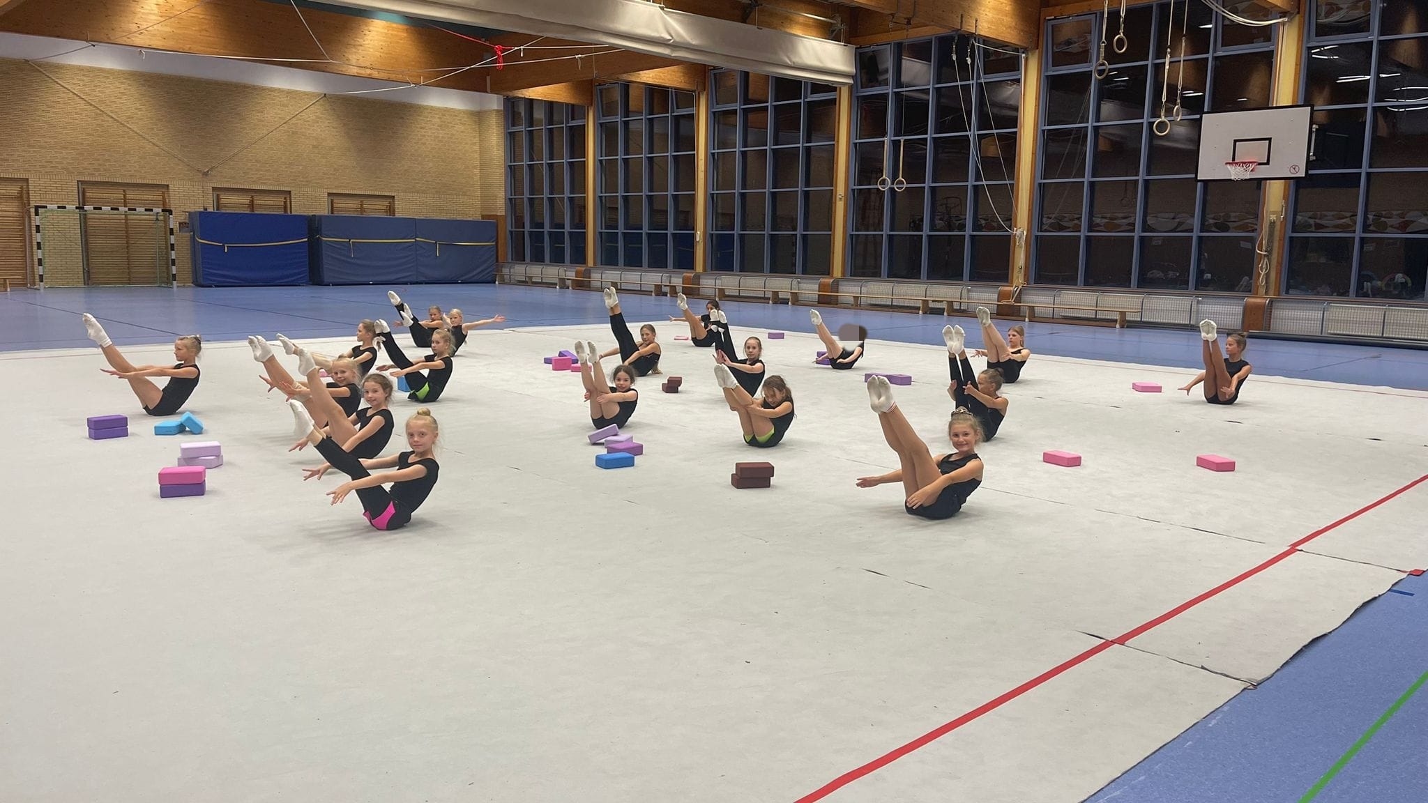 Gruppe macht Gymnastikübungen in einer Sporthalle.