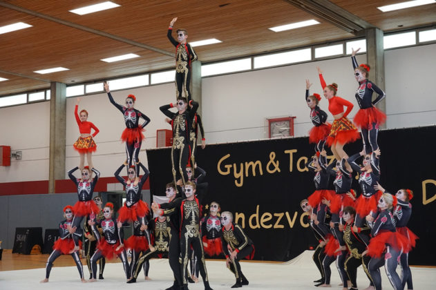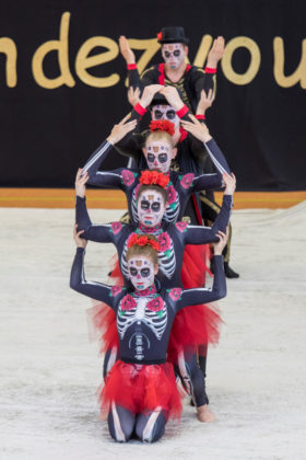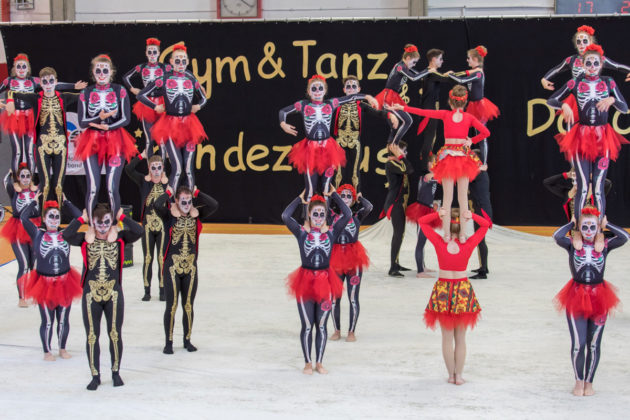Und schließlich „Hervorragend“ für die „Roten Hosen“ Showgruppe des SC Gut Heil Neumünster. „Dia de los muertos“ oder… Der Tag der Toten … hieß die atemberaubende Vorführung. Die kreativen, bunten Kostüme, die Maske, die Musik passten exakt zur Vorführung. Die atemberaubende Akrobatik, präsentiert mit einer guten Sicherheit, zeigte das Können und die Erfahrung dieser Gruppe… oder besser Großgruppe. Denn annähernd 40 Teilnehmer gehören zum Team.