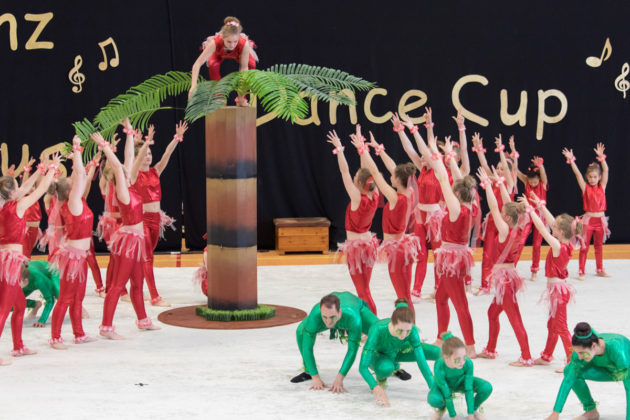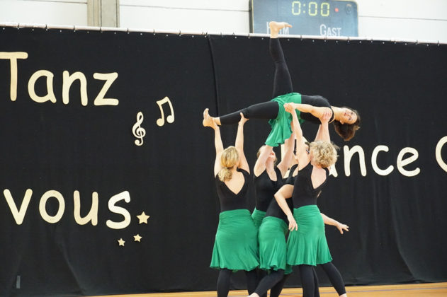 Die Gruppe „Face“ vom TuS Holtenau zeigte die Kriegergewohnheiten des unentdeckten Leguanervolkes tief im Amazonas. Gute Akrobatik, gepaart mit Turn- und Tanzelementen, dazu die interessante Kostümgestaltung in knallgrün passten alles in allem super zur Vorführung.